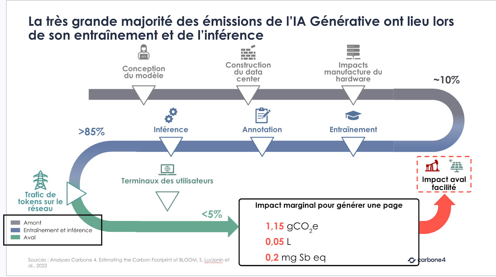 Plus largement, une analyse du modèle BLOOM (176 milliards de paramètres) montre que, sur l’ensemble de son cycle de vie, la phase d’inférence peut représenter entre 70 et 80 % des émissions totales lorsque le modèle est massivement utilisé.