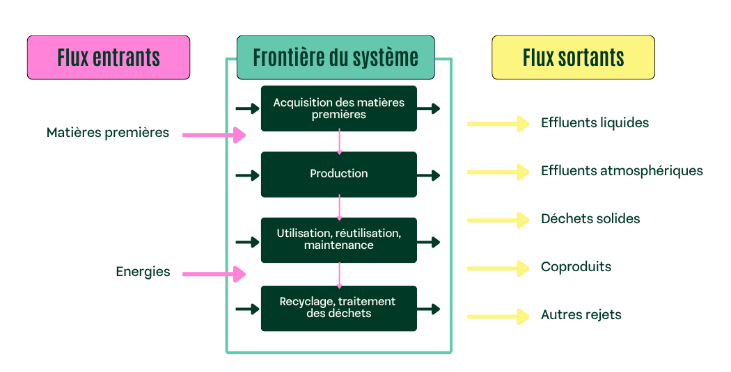 Plus concrètement, pour chaque étape du cycle de vie que vous avez choisi d'étudier (extraction des matières premières, fabrication, transport, utilisation, fin de vie), vous allez devoir effectuer un bilan précis des flux de matière et d’énergie qui entrent dans le système, mais également de tout ce qui en sort.