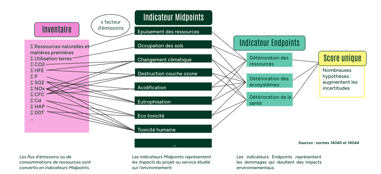 Les indicateurs endpoints présentent l’avantage d’être plus faciles à interpréter pour un public non expert, car ils synthétisent l’information. En revanche, ils introduisent davantage d’incertitudes que les indicateurs midpoints, en raison des étapes supplémentaires de modélisation.
