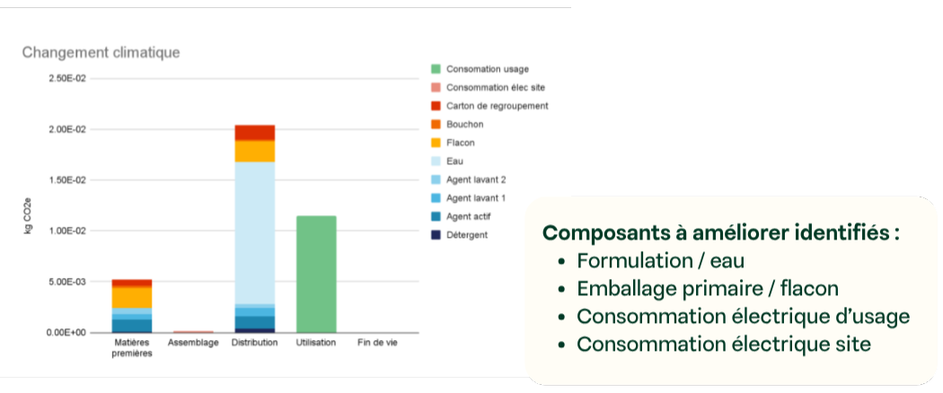 L’analyse visuelle des résultats permet d'identifier rapidement les postes les plus impactants par étape du cycle de vie (matières premières, fabrication, transport, utilisation, fin de vie) et par indicateur environnemental (changement climatique, santé humaine, consommation d'eau, etc.).