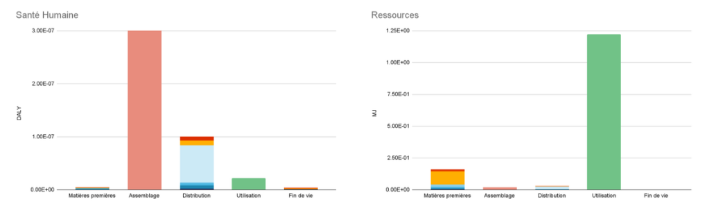 Cette double lecture permet ainsi de voir quelles étapes pèsent le plus sur quel indicateur, d'identifier rapidement les postes les plus impactants et d’éviter les transferts de pollution.