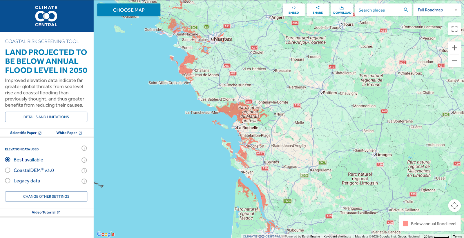 - Submersion marine sur les littoraux : c’est une inondation temporaire du littoral sous l'effet de conditions météorologiques et marégraphiques défavorables. C’est donc différent de l’élévation du niveau de la mer et de l’érosion des côtes. Sur ce dernier point, sachez que l'ONG américaine Climate Central a d’ailleurs créé une carte pour projeter votre ville en 2050 et voir l’impact de la montée des eaux.
